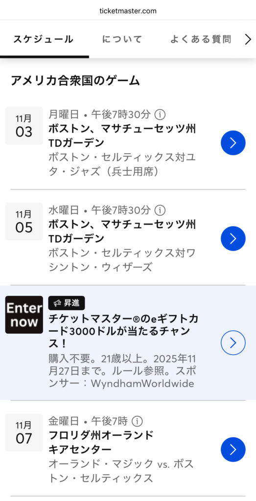 なお、NBAはテレビ放送の都合などでキックオフ時間が数時間動くことがあり、この場合も購入済みチケットは振替後の日程で有効となるのが基本。合わなくなったら、自分でリセールに出して処分するのが定石です。