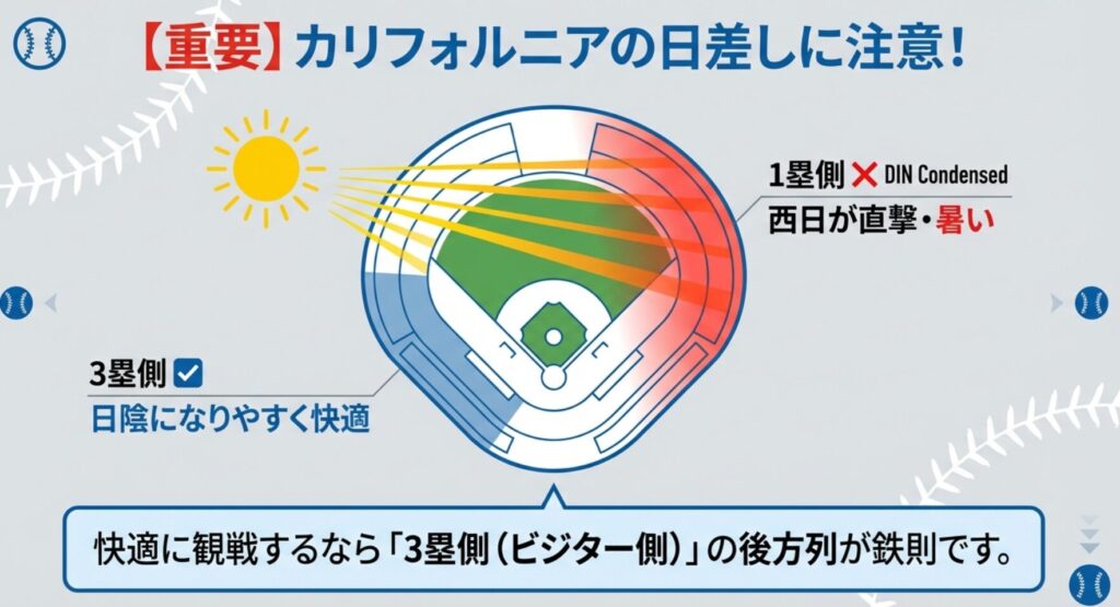 ドジャースタジアムの構造上、1塁側(ホーム側・偶数番号席)は西日が直撃しやすく、試合後半まで日差しが残ります。