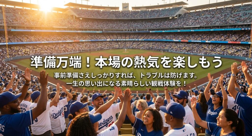 しっかりと事前準備をして、憧れのドジャースタジアムでの観戦を、トラブルのない最高の思い出にしてくださいね!