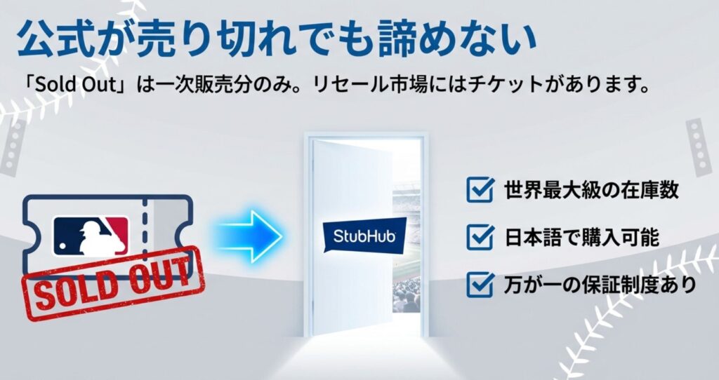 実は、MLBのチケット販売において「完売」という言葉は、あくまで「一次販売分の在庫がなくなった」という意味に過ぎません。