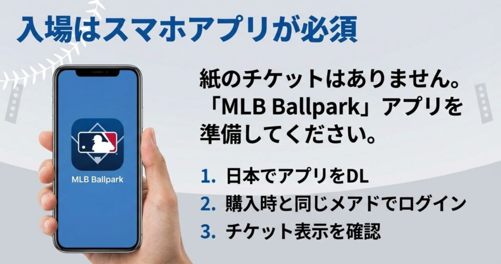 紙のチケットは原則として廃止されており、入場にはスマートフォンアプリ「MLB Ballpark」の提示が必須です。