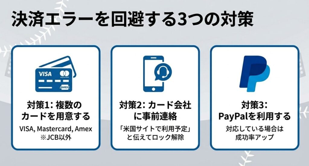 - カード会社への事前連絡: 旅行前や高額決済の前に、カード会社のサポートデスクへ電話し、「〇月〇日頃、米国のチケットサイト(MLB公式サイトなど)で決済をする予定がある」と伝えて、セキュリティロックを緩和してもらうのが最も確実な方法です。