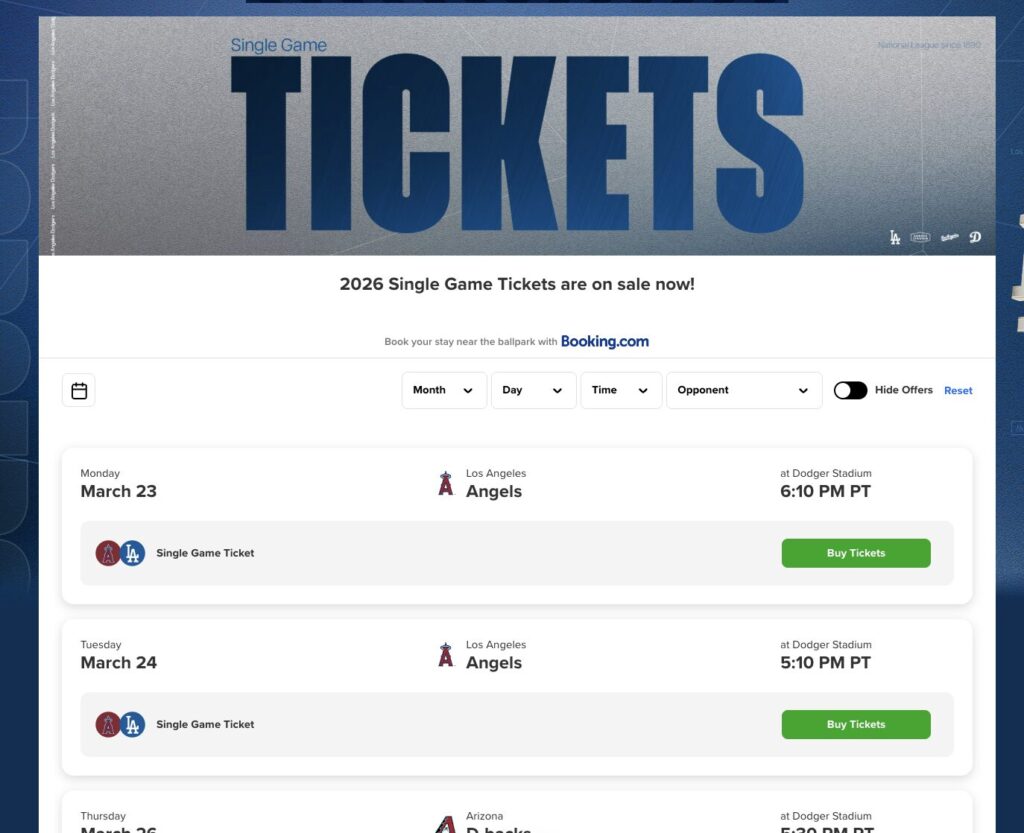 ドジャース公式サイトの「Single Game Tickets」ページにアクセスし、観戦したい試合を選びます。「Buy Tickets」というボタンが表示されているので、そこをクリックします。