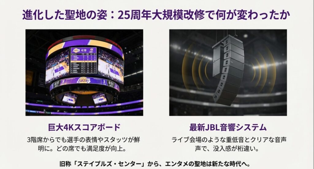 長年親しまれた「ステイプルズ・センター」からの変化や、最新の設備スペックを知っておくことは、現地での体験の質を大きく左右します。