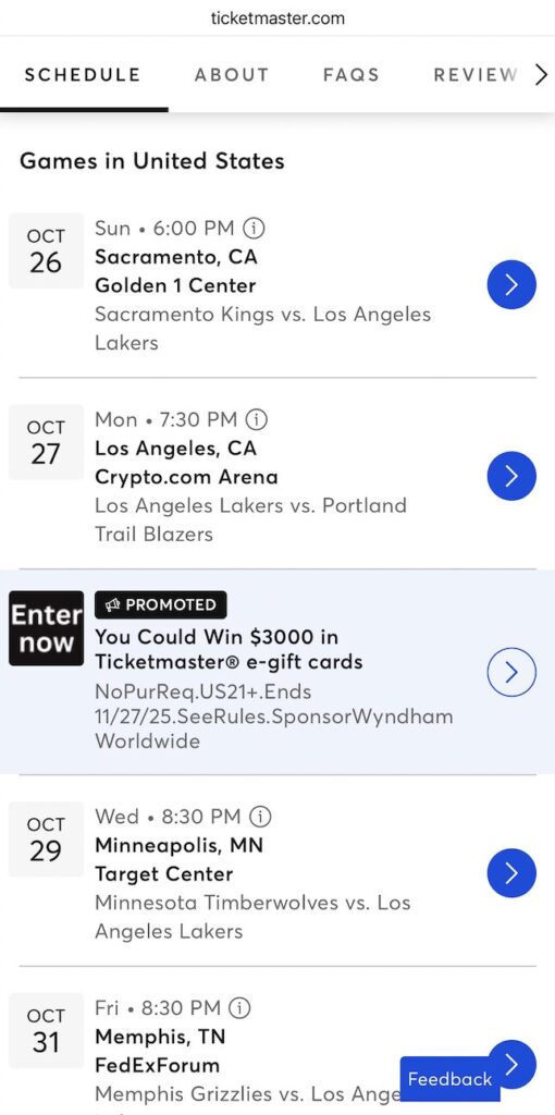 - Ticketmasterのレイカーズ公式ページにアクセスします。
