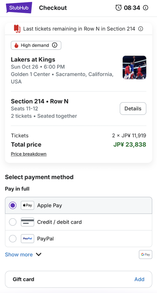 席をカートに入れると、多くの場合5〜10分程度の時間制限が始まります。 事前に登録しておいたクレジットカード、またはPayPal(ペイパル)を使って、落ち着いて決済を完了させましょう。