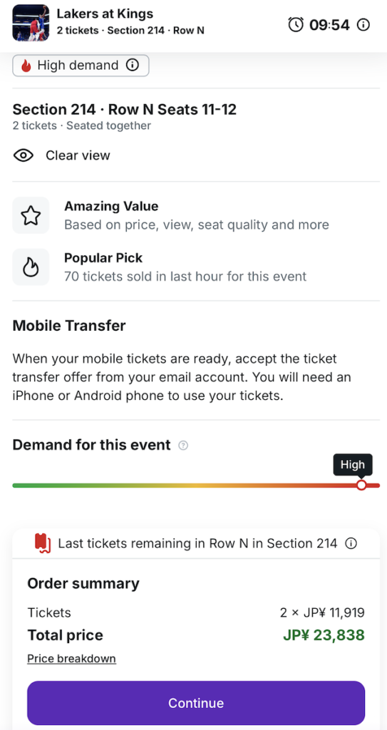 最大の強みは、その圧倒的な在庫量にあります。Ticketmasterではすでに「完売」と表示されている人気試合であっても、StubHubを探せば良席や連番のチケットが見つかる可能性が非常に高く、現実的に選択肢が最も多いのがこのプラットフォームです。ベンチ裏や通路側といった、座席条件にこだわりたい場合にも有力な選択肢となります。