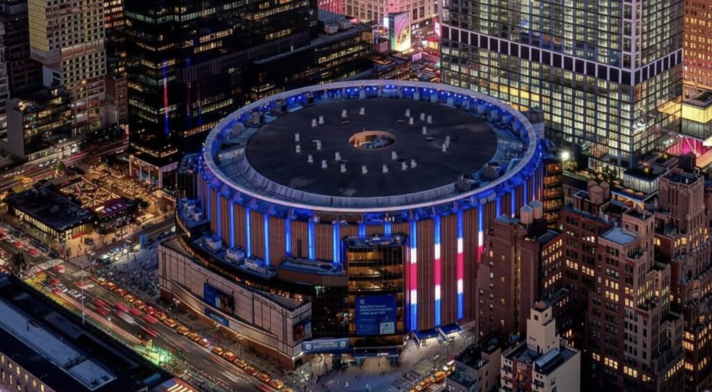 ニューヨーク・ニックス(NBA)やニューヨーク・レンジャース(NHL)の本拠地として知られ、試合以外にも多彩なイベントが開催されます。収容はバスケットボール時で約2万人規模とされ、どの席からもコートが見やすい設計が特徴です。