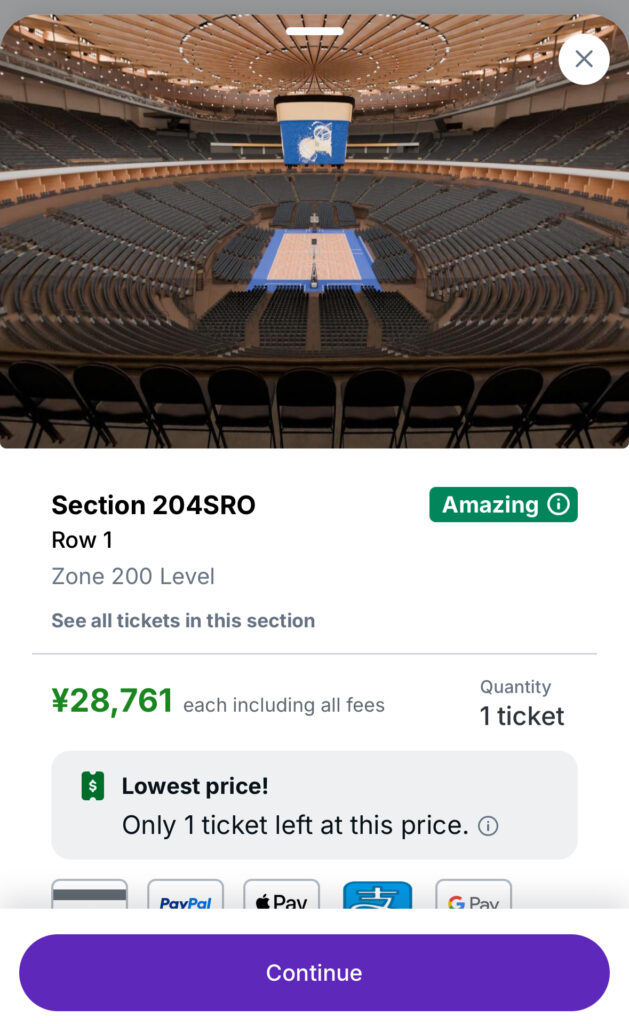 総額比較は“手数料込み”で行うのがコツです。TicketmasterもStubHubもサービス料が加算されるため、表示価格だけで判断すると逆転します。さらに、同じセクションでも列や角度で視界が変わり、価格差が生じます。コスパ重視なら、100番台の中〜後方や、200番台コーナー寄りの見切れが少ない列をチェックすると、雰囲気と視界のバランスが取りやすいです。