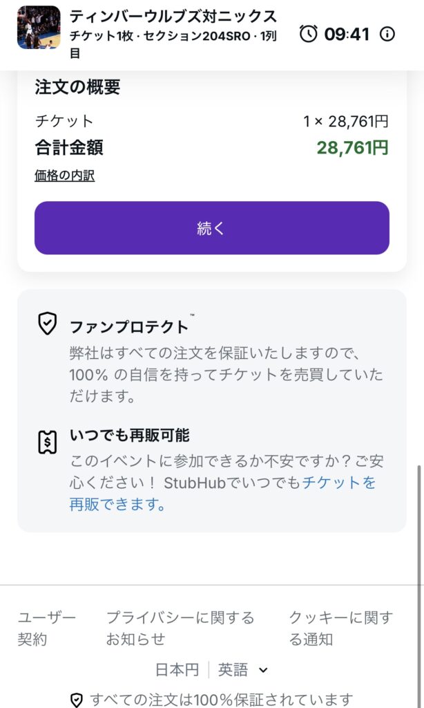 StubHubは大手リセールとして信頼性が高く、偽物や無効チケットに対する100%保証を掲げています。万一、出品者の不備で入場に使えない・引き渡しが遅れるといった事態が起きた場合、代替手配または返金でカバーされるのが一般的です。