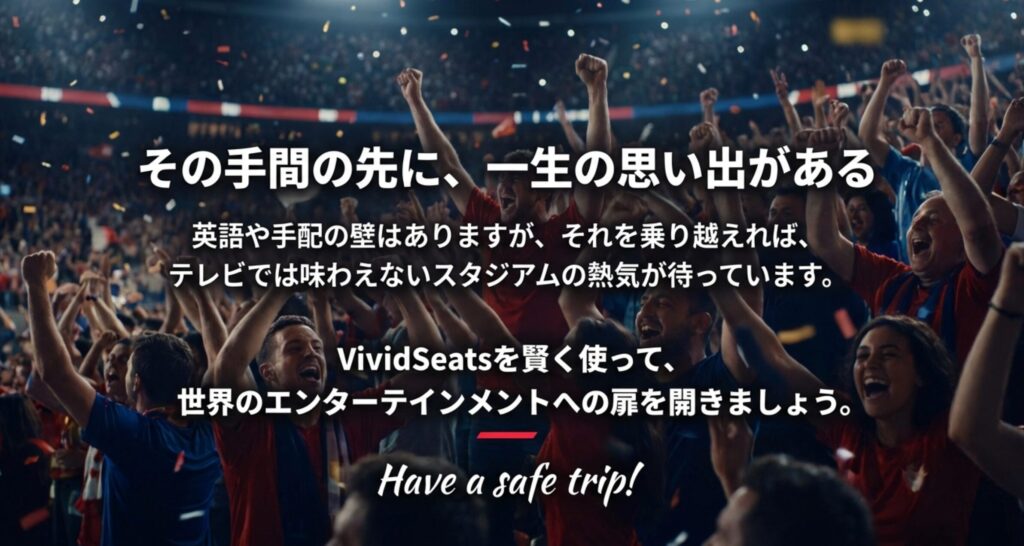 英語の壁や手数の壁はありますが、それを乗り越えた先には、テレビ画面では絶対に味わえない、スタジアムの熱気と感動が待っています。