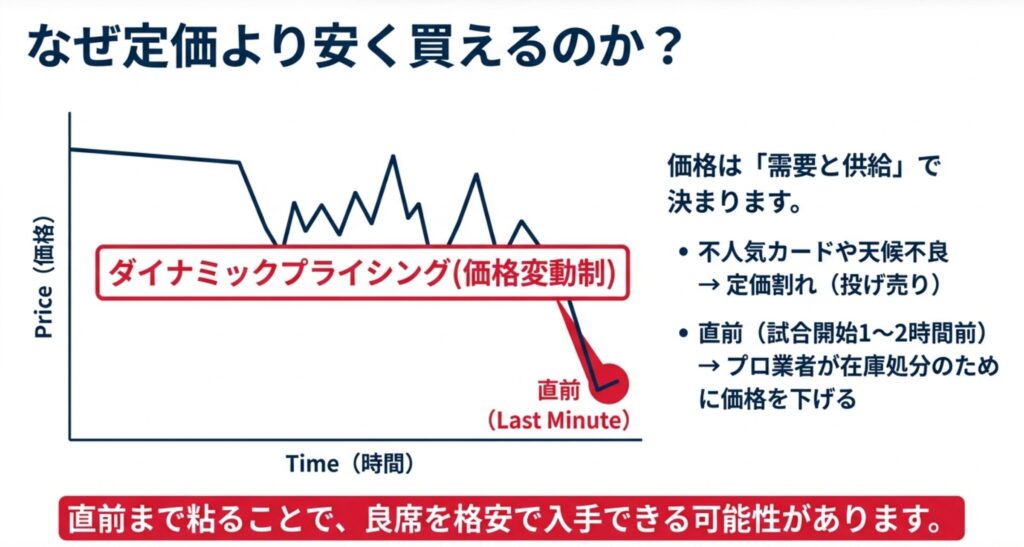 例えば、チームの成績が低迷している時期の平日ナイターや、天候が崩れそうな日の試合などは、チケットを持っていても行きたくない人が増えるため、定価の半額以下で投げ売りされることがよくあります。