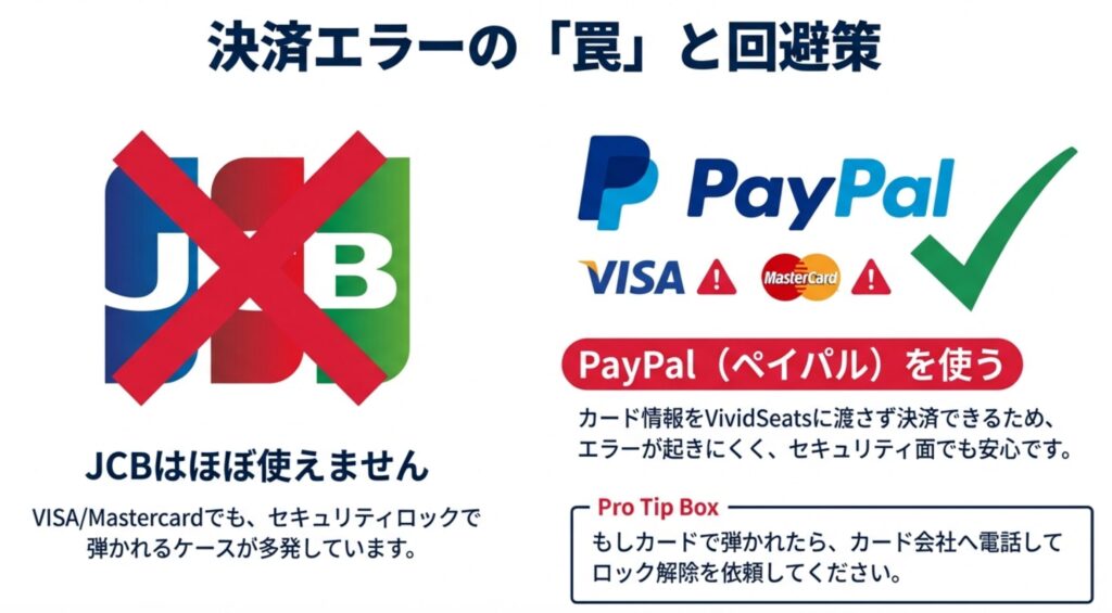 PayPalに日本のクレジットカードを紐付けておけば、VividSeats側にカード情報を直接渡すことなく決済でき、セキュリティ面でも安心ですし、決済エラーも起きにくい傾向にあります。