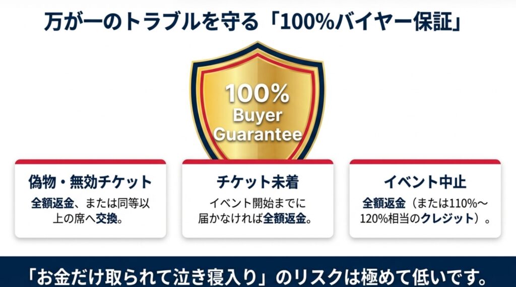 - チケットが偽物だった、または無効だった場合:入場ゲートでスキャンしてエラーが出た場合など、証拠を提示すれば100%保証が適用されます。