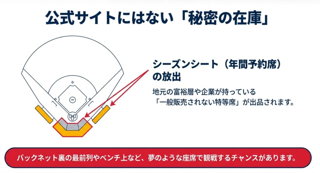 例えば、バックネット裏の最前列付近や、ベンチ上の特等席は、年間予約席(シーズンシート)として地元の富裕層や企業が買い占めています。